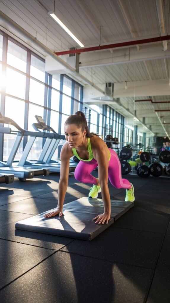 • Mountain climbers combine core tension with cardio, recruiting all abdominal layers while creating significant post-workout calorie burn.